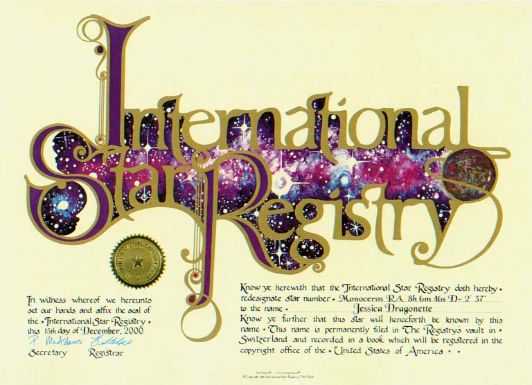 With the help of StarRegistry.com, a star in our galaxy has been named after Jessica! Please click on the banner below for information about naming a star after a loved one!